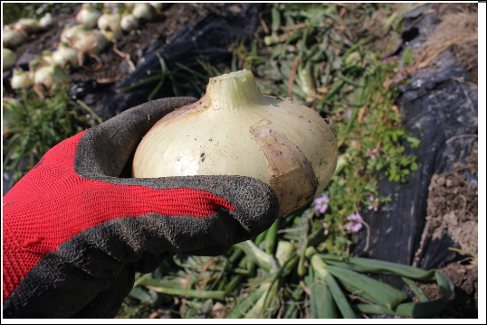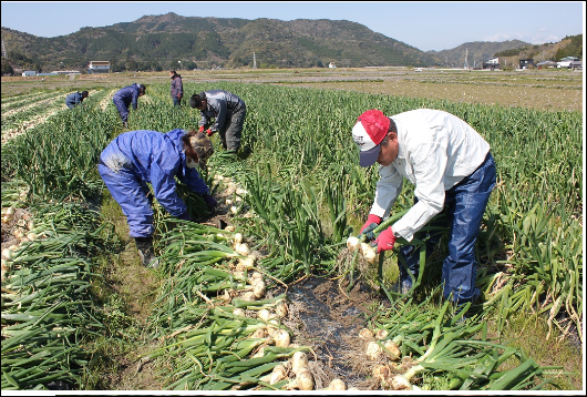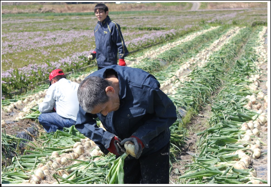 農福連携の障がい者就労体験(たまねぎ収穫作業)の現場に伺い、障がい者8名と福祉作業所職員3名の合計11名とともに宮崎県拠点の職員2名が、ほ場を管理する農業者の指導を受けながら一緒に作業体験と情報収集を行いました。
