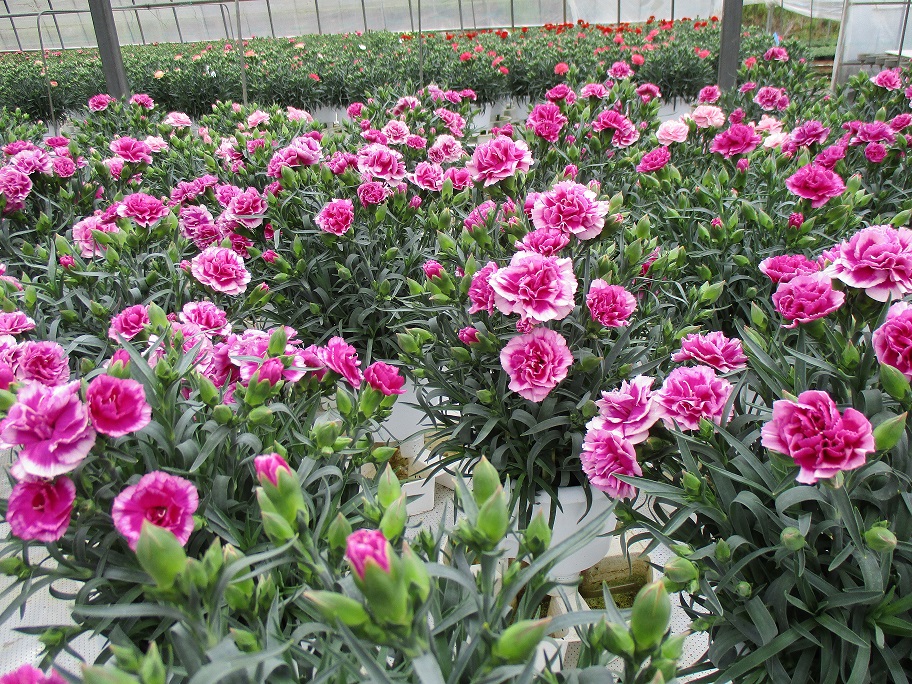 臼杵市野津町で鉢物のカーネーションの出荷が、母の日に向けて始まりました。