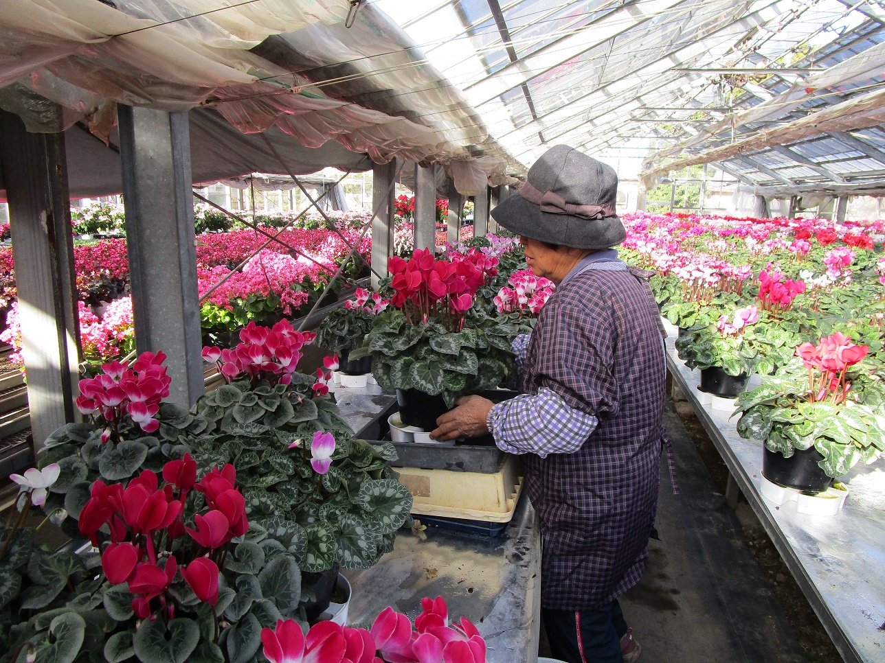 臼杵市野津町で、冬の花として有名なシクラメンの出荷が始まっています。10月の下旬から出荷が始まり、ハウス内では赤やピンク、白などの花が咲き誇っており、クリスマスや正月向けに年末まで出荷作業が続きます。
