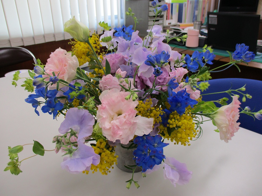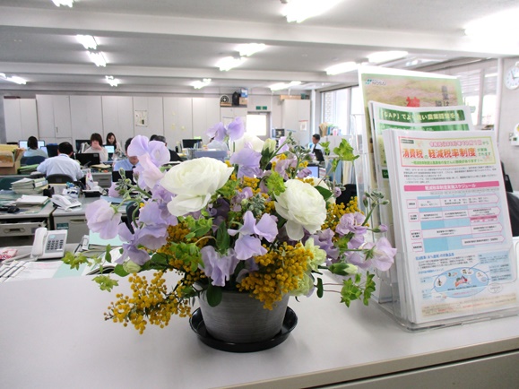 農林水産省は、新型コロナウイルスの影響で需要が減少している花きの消費拡大を図るため、家庭や職場に春の花を飾って楽しむ「花いっぱいプロジェクト」を実施しています。大分県拠点でも玄関や各フロア執務室に主に大分県産のお花を飾っています。