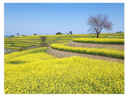 国東(くにさき)半島の北端部に位置する豊後高田市の長崎鼻では、段々畑に一面、菜の花が咲いています。美しい景観を取り戻したい想いを持つ地元の有志が集まり、耕作放棄地を再生し、現在では約17haの広大な畑が広がっています。この段々畑では、春には菜の花、夏にはひまわりが一面に広がります。菜の花やひまわりの種は敷地内の搾油施設で加工され、無添加の食用油脂等として販売されています。