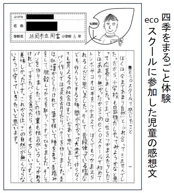 「四季をまるごと体験ecoスクール」に参加した保護者からは、「麦の畑作りから種まき、収穫、パン作りまでのサイクルに、これだけ多大な労力をかけ、機械や工具を工夫し、まさに持続可能な社会を何千年も続けてきたということのありがたみを実感できました。また、普段は簡単に入手できる塩や小麦粉、パンにも日頃から感謝し、食品ロスの削減、分別リサイクル等できることから環境に配慮していきたいと思いました。」という感想や、子どもからは、「普段使っている塩なども、作ろうとすると時間がかかって大変で、作らなくても買える今の社会はすごいなあと思いました。パン作りでは、麦を育てたり、バターやパンを作りました。どの作業も根気がいるし、つかれるけど、できたパンを食べたら、もちもちしてすごく美味しかったです。これからは、この自然が無くならないように守っていきたいと思います。」などの感想が寄せられています。