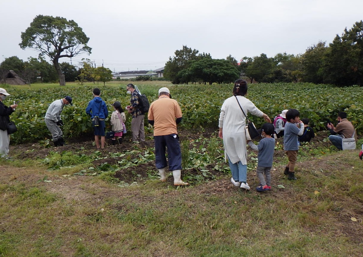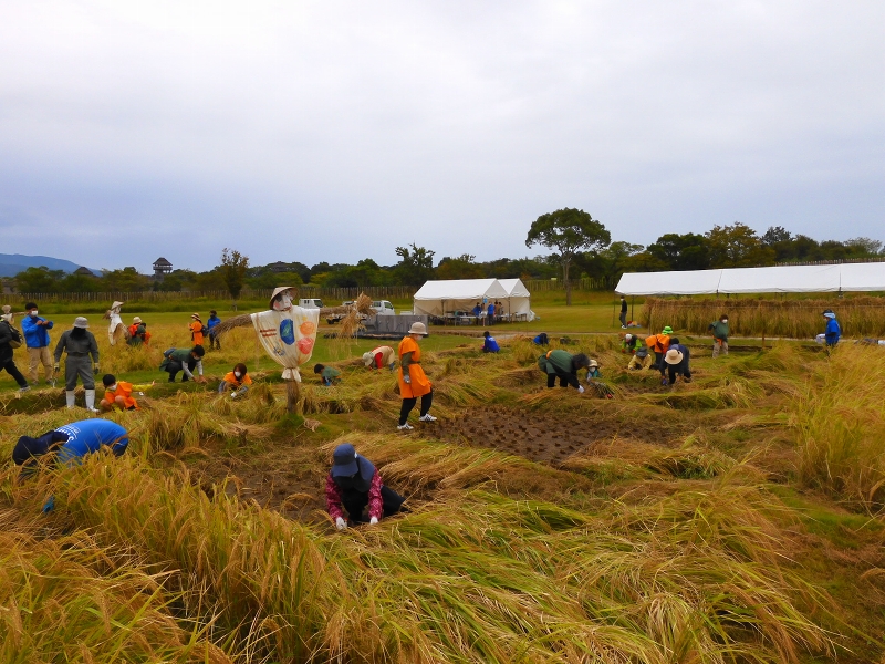 吉野ヶ里歴史公園は、「弥生人の声が聞こえる」を基本テーマに、遺跡エリア(国営エリア)や遊びの原(県立エリア)など、四季を通じて誰もが一日中楽しく過ごせる公園となっています。10月9日(日曜)には、復元された古代の水田で、弥生時代の衣装「貫頭衣」を着て稲刈りの体験が行われました。その他にも赤米料理のふるまいや、南のムラの畑で栽培しているエダマメ収穫体験もありました。毎年大変人気のイベントです。