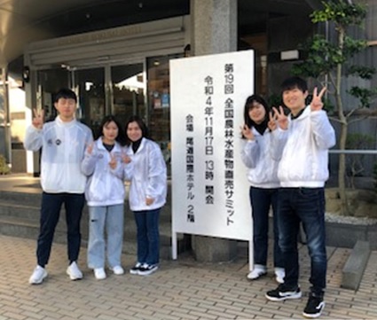 第5回食育活動表彰の消費・安全局長賞を受賞した、九州国際大学現代ビジネス学部の村上ゼミ「子ども食堂チーム」は、学内や地域での活動のほか、九州農政局の食育ワークショップなど様々な活動に参加しています。また、地産地消マーケティングをテーマの1つとして、産直市場の生産者・ 購入者の関係性を研究しているため、今年度は、11月17、18日に広島県尾道市で開催された「第19回全国農林水産物直売サミット」のスタッフとしても活動しました。