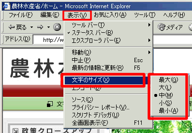 2. 表示されたメニューの「文字のサイズ」にマウスポインタを合わせ、追加表示されたメニューから希望の文字の大きさを選びます。 文字の拡大縮小は、画像やコントロールのサイズは元のままで、文字の大きさだけを変更します。