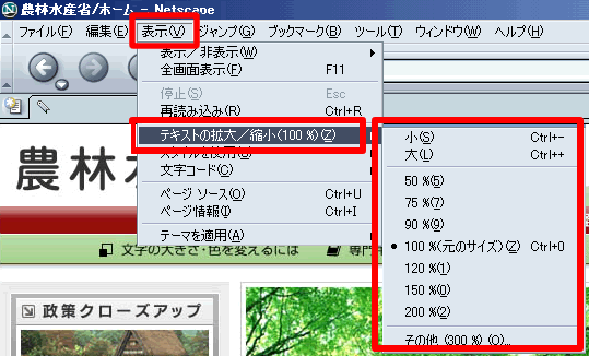 2. 表示されたメニューの「テキストの拡大/縮小」にマウスポインタを合わせ、追加表示されたメニューから希望の文字の大きさを選びます。