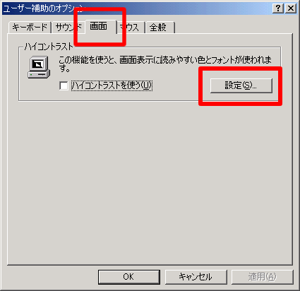 3. ハイコントラストの設定を変更するには、「画面」タブの「設定」をクリックします。