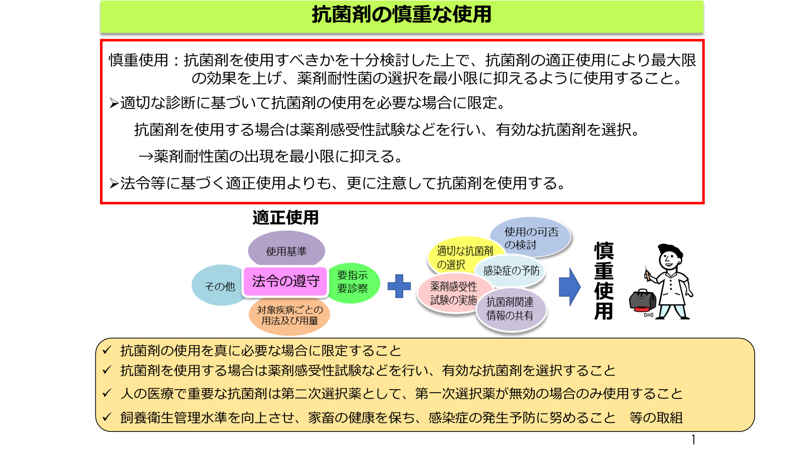 動物用抗菌性物質製剤の使用による薬剤耐性菌のリスクを低減するためには、国だけでなく、獣医師、生産者などの関係者がそれぞれの責任を果たし、慎重使用(抗菌剤を使用すべきかどうを十分検討した上で、抗菌剤の適正使用により最大限の効果を上げ、薬剤耐性菌の選択を最小限に抑えるようにしようすること)に努める必要があります。