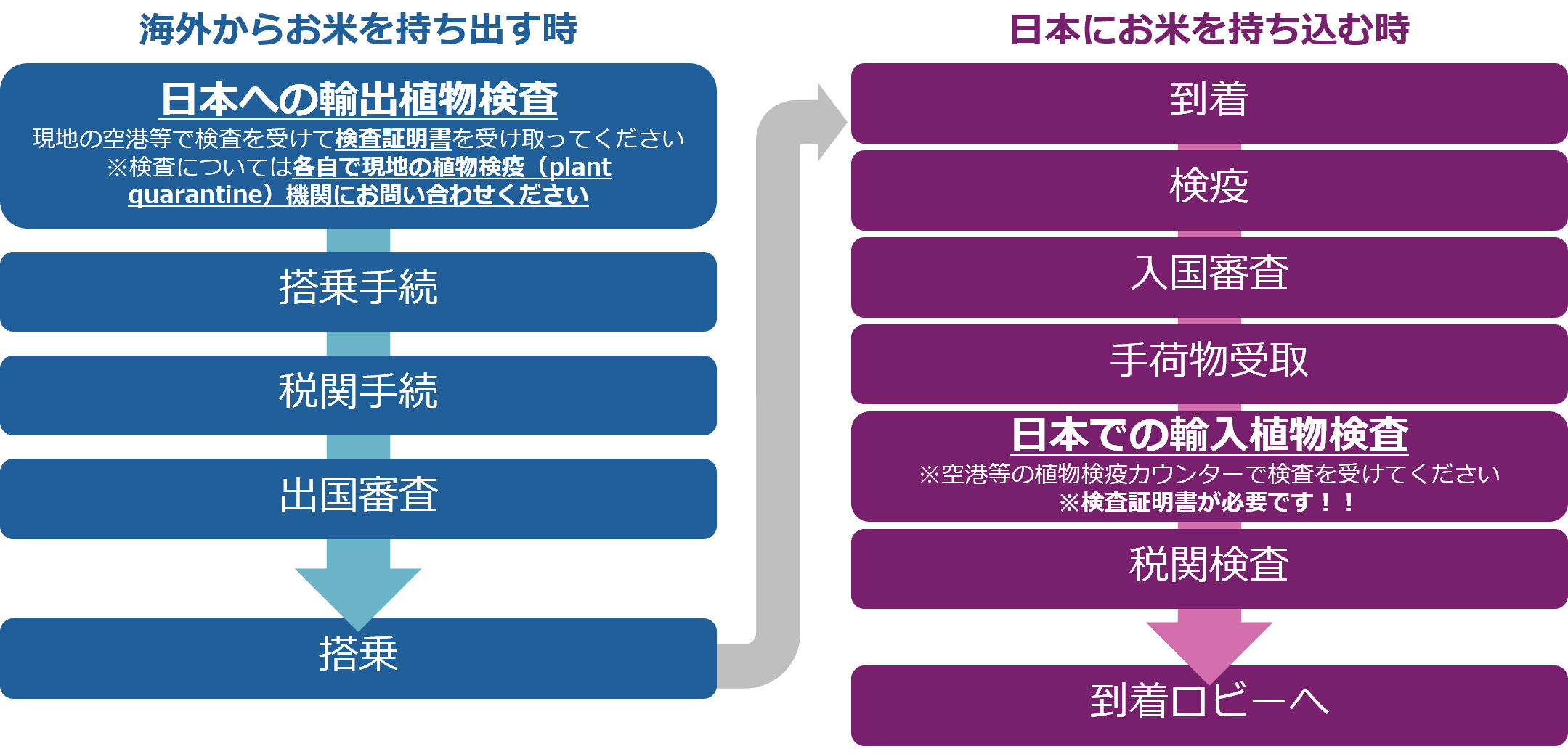 - 海外からお米を持ち出す前に、現地の空港等で輸出植物検査を受けて検査証明書を受け取ってください。なお、検査については各自で現地の植物検疫(plant quarantine)機関にお問い合わせください。