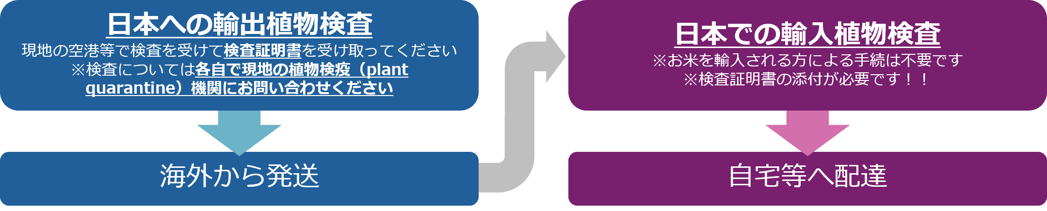 - 国際郵便物でお米を持ち込む場合には、輸出国での輸出植物検査に加えて、商業用、研究用、個人消費用等の目的や数量に関わらず輸入検査を受ける必要があります。詳しくはこちらをご覧ください。