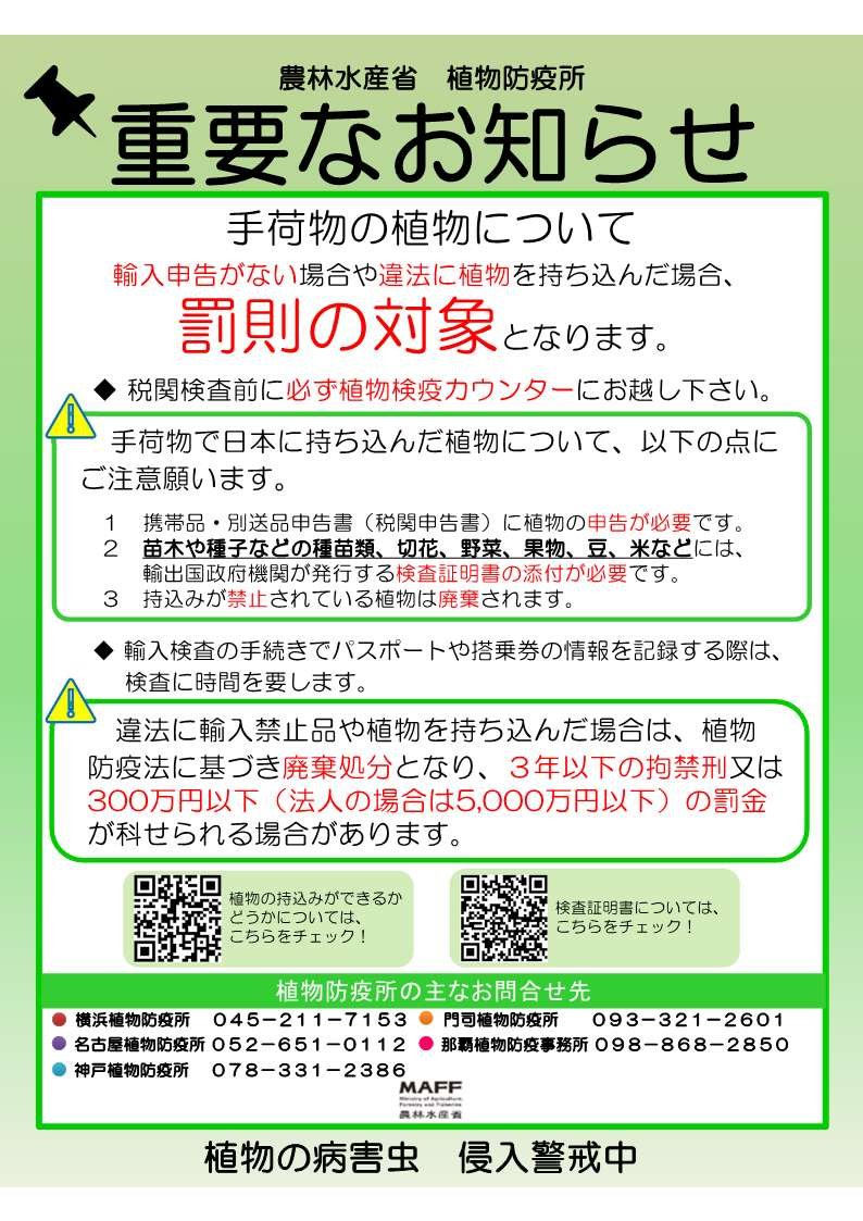 - 手荷物で海外から植物を持ち込む際、輸入申告がない場合や違法に持ち込んだ場合、罰則の対象となります。