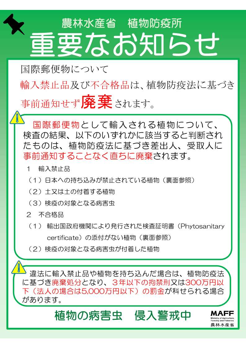 - 国際郵便物として輸入される植物について、検査の結果、輸入禁止品又は不合格品のいずれかに該当すると判断されたものは、植物防疫法に基づき差出人、受取人に通知することなく直ちに廃棄されます。