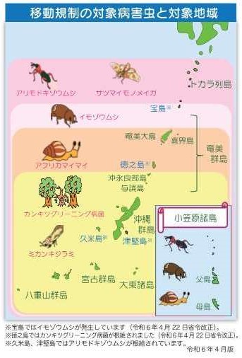 南西諸島(沖縄・奄美)、小笠原諸島には、国内の他の地域に発生していないアリモドキゾウムシ、アフリカマイマイなどの農作物に大きな被害を与える病害虫が発生しています。 これらの病害虫を発生していない地域にまん延させないために、これらの病害虫及びその寄主植物などの移動を禁止又は制限しています。 |