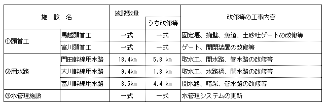 4.主要施設の概要会津南部地区のかんがい用水は、馬越頭首工に設置された門田幹線用水路、大川幹線用水路の取水口及び富川頭首工に設置された富川幹線用水路の取水口から取水され、導水トンネル、パイプライン、開水路等を経て受益地に送水されています。1)馬越頭首工 ![]() 2)富川頭首工 ![]() 3)幹線用水路 ![]() ![]() 5.位置図![]()