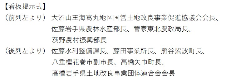 看板掲示式は、事業所にて、大沼山王海葛丸地区国営土地改良事業促進協議会会長、佐藤岩手県農林水産部長、熊谷紫波町長及び菅家東北農政局長らが出席し行われました。開所式は、ホテル花巻にて、来賓及び関係者合わせて約80名が出席し開催されました。