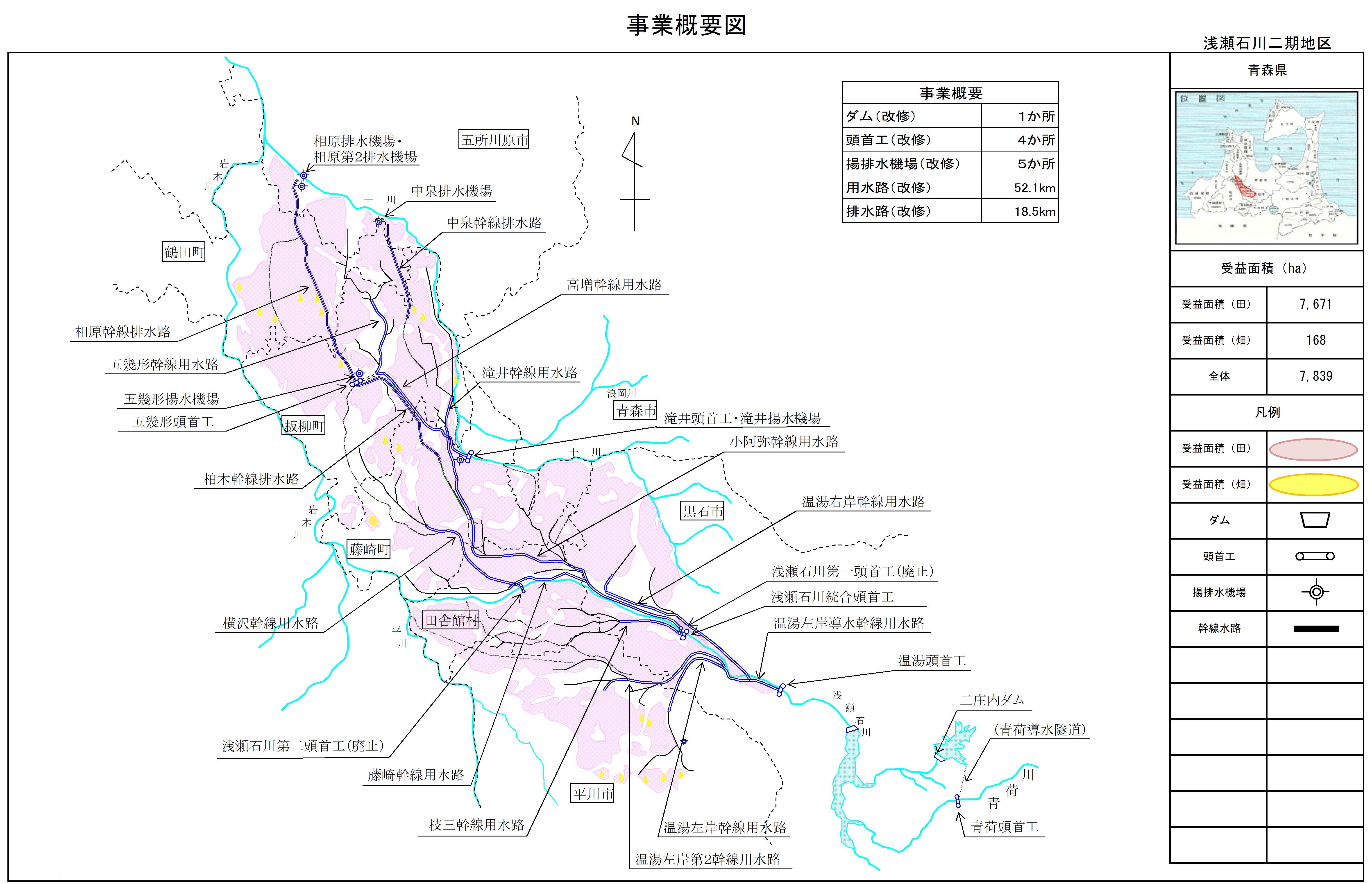 事業の目的・内容事業の概要浅瀬石川二期地区は、青森県の南西部に位置し、青森市、黒石市、五所川原市、平川市、南津軽郡藤崎町、同郡田舎館村、北津軽郡板柳町及び同郡鶴田町にまたがる約7,800haの農業地帯です。 本地区では、水稲を中心に、水田の畑利用による大豆、野菜等のほか、果樹園でのりんごを組み合わせた複合経営が展開されています。 地区の基幹的な農業水利施設は、国営浅瀬石川土地改良事業(昭和50年度~平成7年度)等により造成されましたが、経年的な施設の劣化により、電気機械設備の故障のほか、貯水池、頭首工、揚排水機及び用排水路において、コンクリート構造物のひび割れ、欠損、倒伏等が生じ、施設の維持管理に多大な費用と労力を要し、農業用水の供給と排水機能の維持に支障を来しています。さらに、頭首工、排水機及び用水路が大規模地震によって損壊した場合には、地域に甚大な被害を及ぼすおそれがあります。 このため、本事業では、老朽化が進行した施設を改修し、これと一体的に必要な耐震化のための施設整備を行い、併せて関連事業で区画整理を実施することにより、農業用水の安定供給、排水機能の維持、施設の維持管理の費用と労力の軽減を図り、農業生産性の向上と農業経営の安定に資することを目的としています。 受益面積