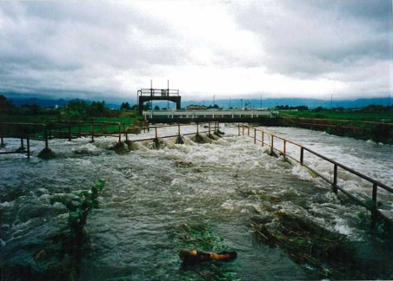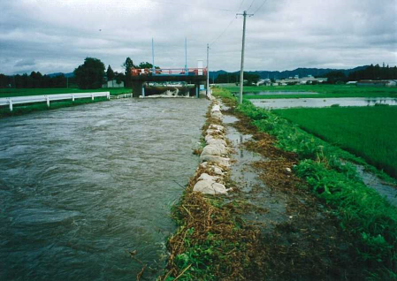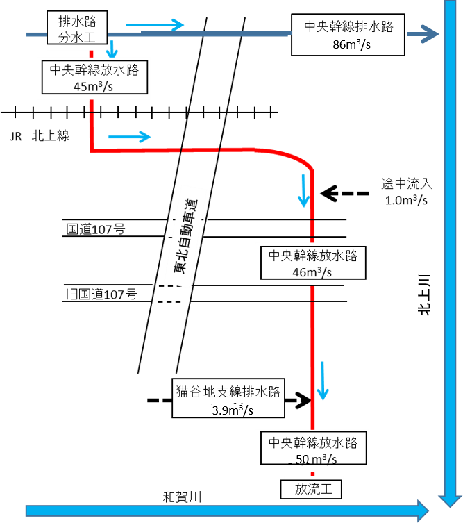 排水事業の効果発現排水対策の必要性について近年の降雨形態及び土地利用等の変化により流出量が増加し、中央幹線排水路において、溢水による湛水被害が過去7回発生しています。 整備概要について中央幹線排水路で流下能力が不足する容量を和賀川へ放水する中央幹線放水路の拡幅工事を平成26年度より開始しました。10年に1回程度発生する降雨を想定し、既設の中央幹線放水路1.6kmを拡幅しました。 整備状況について工事は令和元年度に完了し、排水事業の効果が令和2年度より発揮されています。