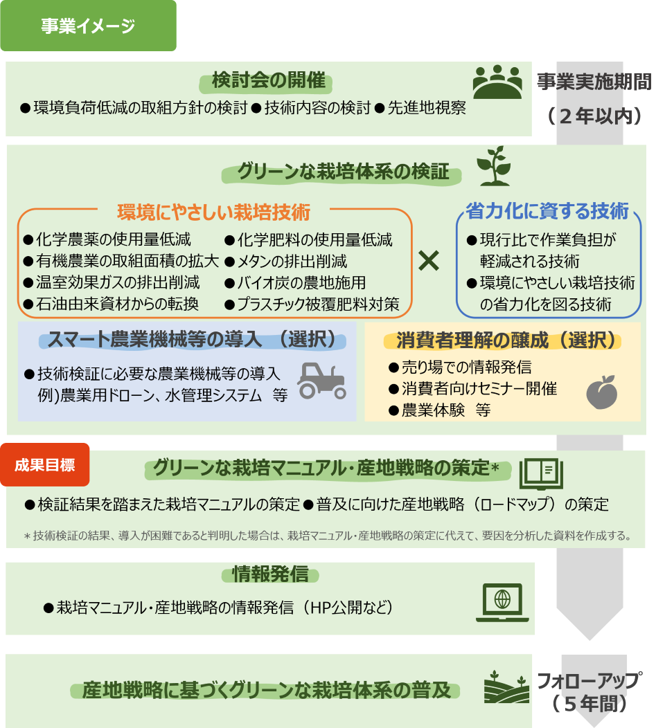 - グリーンな栽培体系加速化事業とは、産地に適した環境にやさしい栽培技術と省力化に資する技術を検証して、新たな栽培体系(グリーンな栽培体系[農林水産省へリンク])の普及に向けたグリーンな栽培マニュアルと産地戦略を策定する事業になります。