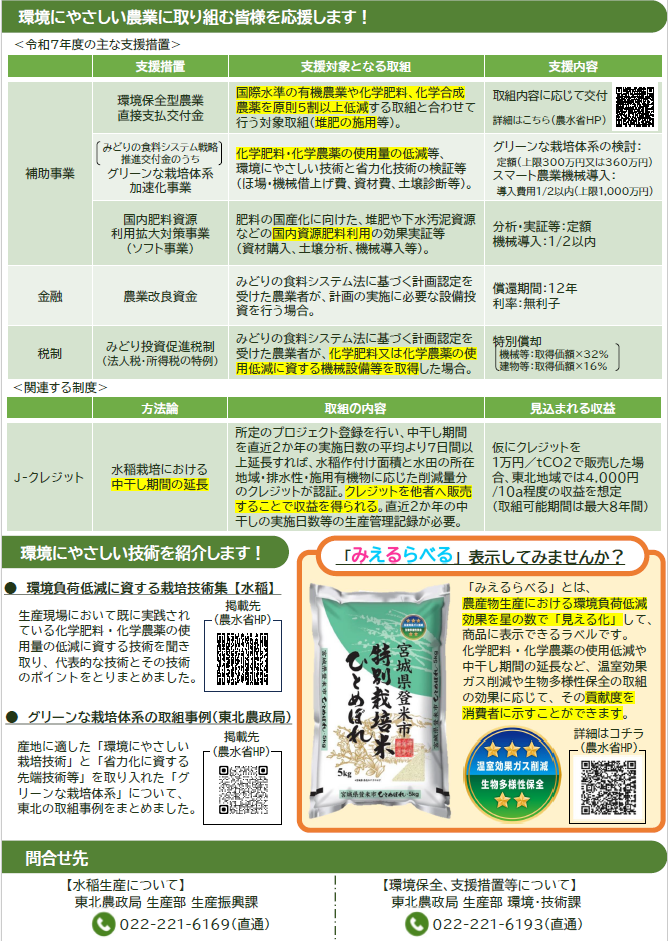 環境負荷低減に向けた取組が営農の1つの選択肢となるよう、具体的取組とその取組が経営に与えるメリットを示しつつ、支援予算や制度についてまとめました。ぜひ環境にやさしい米づくりに取り組んでみませんか?