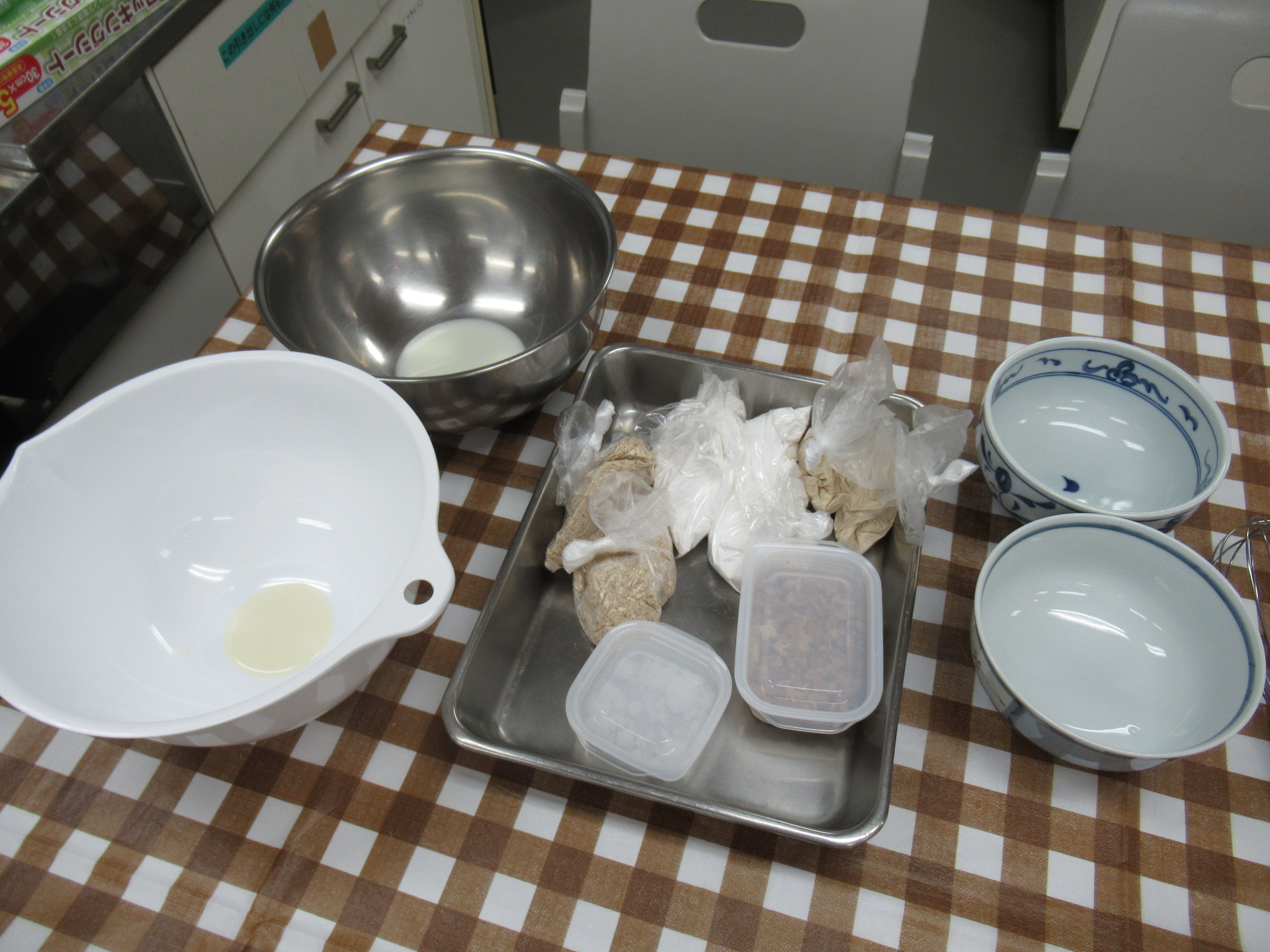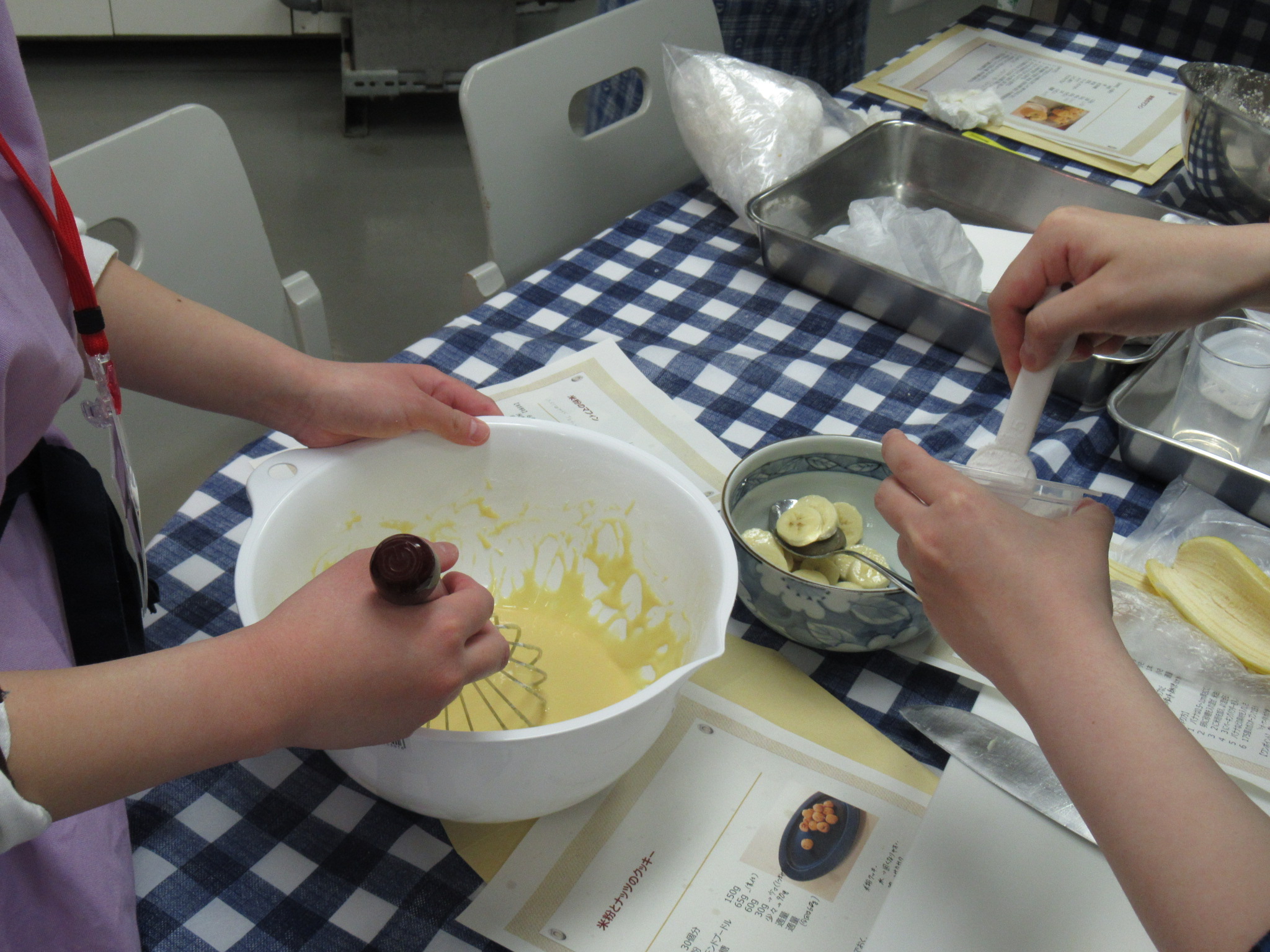 今回のメニューは、米粉のマフィンと米粉とナッツのクッキーの2品です。ご家庭で子供と一緒に楽しく作れる簡単レシピを用意していただきました。小麦粉の代替として米粉を使用し、安全・安心に食べられるお菓子にチャレンジします。「米粉は、小麦アレルギーを持つ方でも安心で、消化が良く、吸油量が低くヘルシー、優しい甘みで、しっとりもっちりした食感は日本人好み、ふるう必要がなく、水に溶けやすいので料理も後片付けも簡単です。」と宍戸さん。