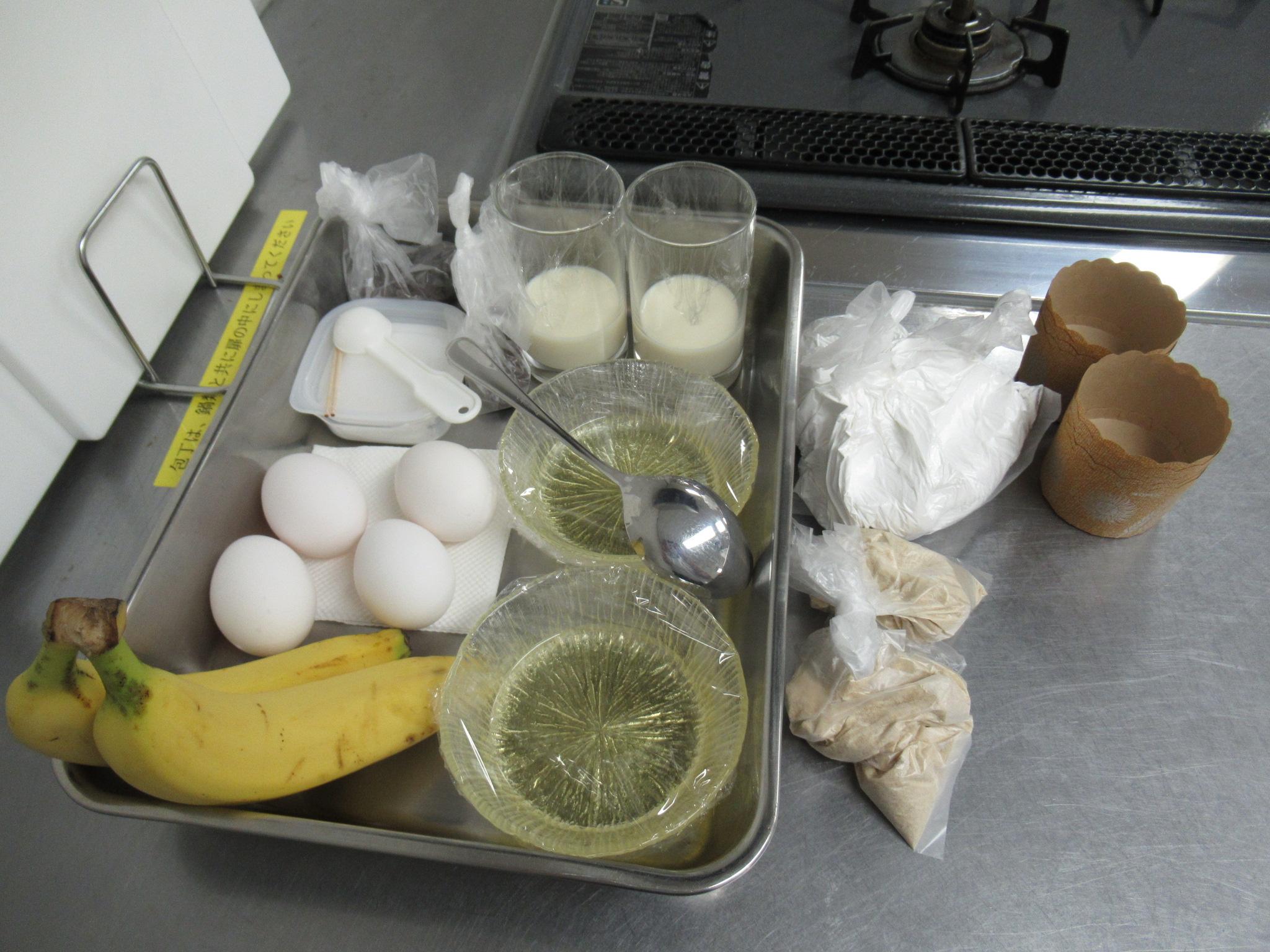| 容器に流し込んで焼きます | おいしそうなマフィンの完成 | 試食の前に今日のおさらいです |