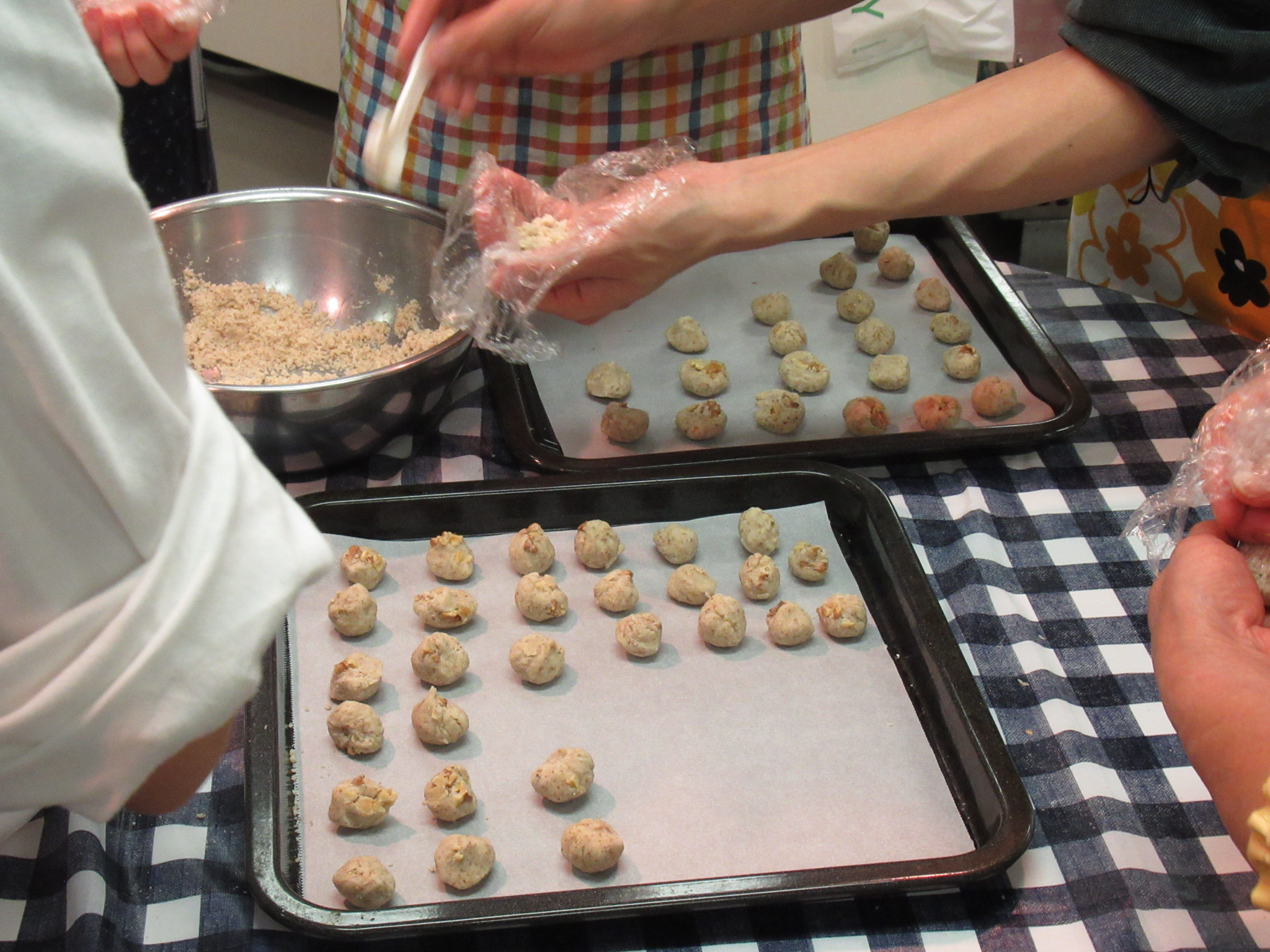 | 生地を丸めて焼きます | クッキーが焼き上がりました | マフィンの生地を混ぜます |