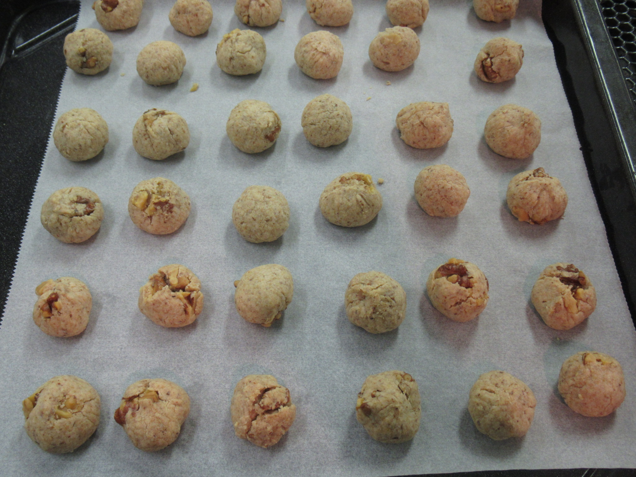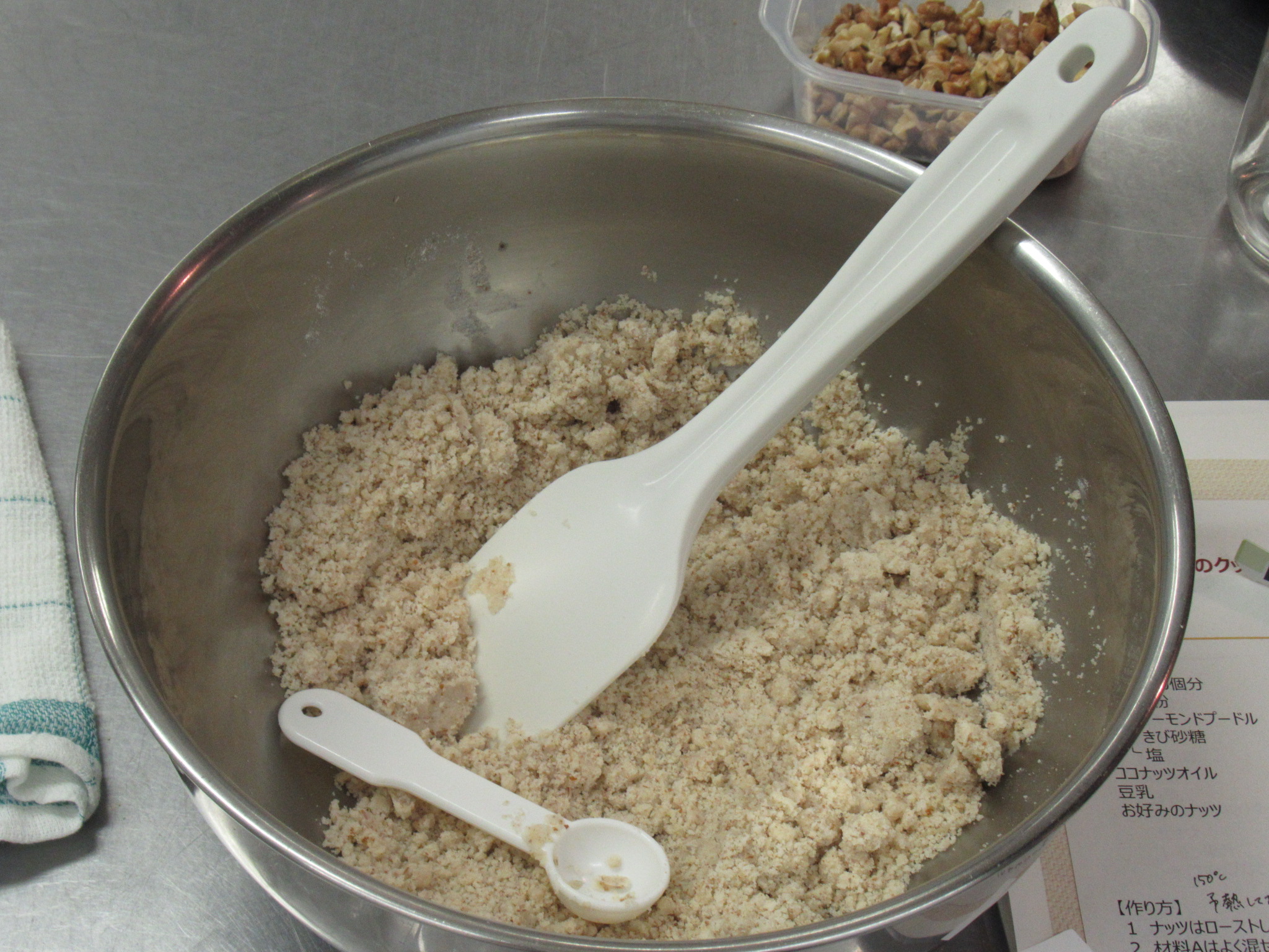 まずは、米粉とナッツのクッキー。最初に細かく刻んだナッツと生地になる米粉、アーモンドプードル、きび砂糖、塩を混ぜ合わせておきます。準備が出来たら、刻んだナッツに溶かしたココナッツオイルと豆乳を入れ混ぜ合わせます。次に、混ぜ合わせたココナッツオイルと豆乳を生地に混ぜ合わせます。後は簡単、混ぜ合わせた生地を等分に丸めて150度のガスオーブンで20分から25分程度焼くだけで美味しい米粉クッキーが完成。