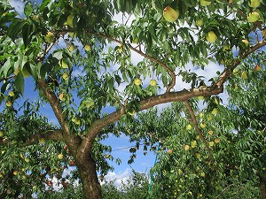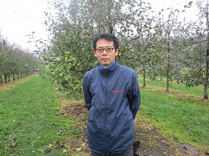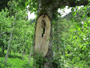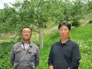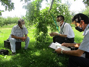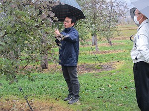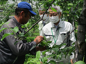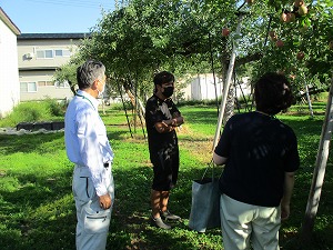 | りんごの摘果について説明する田中販売部長(左) | 大雪により枝が裂けたりんごの幹 | JA秋田ふるさと りんご部会の粟津部会長(右)、田中販売部長(左) |