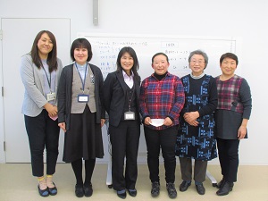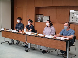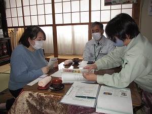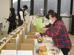 | 「母さんのおすすめセット」の発送作業を行う協議会の皆さん | 意見交換の様子 | 左から、田口さん(仙北市交流デザイン課)、田口さん(協議会事務局員 、民宿孫六荘)、伊藤さん(同事務局長)、門脇さん(同副会長、星雪館)、藤井さん(泰山堂)、川井さん(農家民宿ふる里) |