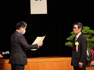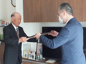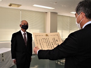 新型コロナウィルスの感染防止の観点から全国表彰式が中止となったため、秋田県拠点で授賞式を行うこととなり、藤田地方参事官から出島博昭氏(秋田県大館市)に大臣賞を授与しました。