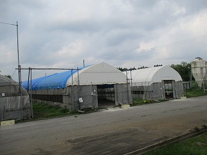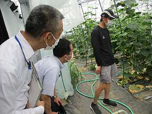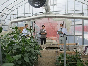 | ねぎ係長(右)から説明を受ける笠原総括、髙橋主任 | ねぎ課と農業技術センターの正面入り口 | 農業技術センターの研修用ハウス(スナップえんどう) |
