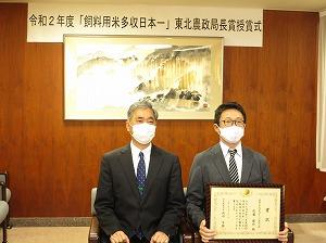 4月19日、受賞者宅と秋田県拠点において「令和2年度飼料用米多収日本一」の東北農政局長賞授賞式を行いました。