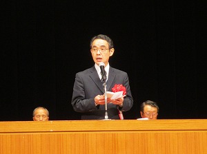 | 農林水産大臣賞の授賞式 | 受賞のあいさつをする出島氏 | (写真左から)藤田地方参事官、出島氏、JA秋田北米穀部佐藤副部長 |