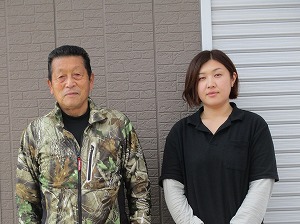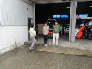 | 柏農興事務室での意見交換の様子 | 大型農機格納庫前で意見交換 | 父親で法人代表の佐井幸裕さん(左)と 鈴木歩未さん(右) |