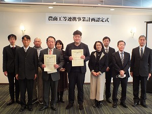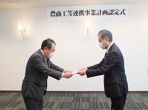 2月10日、ルポールみずほ(秋田市)において令和3年度第3回農商工等連携事業計画認定式を行い、中小企業者の株式会社ゆう幸(秋田市)及びくら吉有限会社(仙北市)の佐々木幸生代表取締役と農林漁業者の佐々木雄幸氏(五城目町)に対し認定書を交付しました。