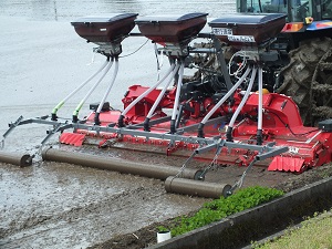 | いもち病防除剤をまぶした種子 | 代掻き整地しながら播種し、塩ビ管で種子を鎮圧 | お話を伺った北川目ファームの藤原稔 氏 |