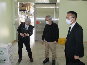| にんにく貯蔵施設で説明をする兜森氏(中央) | にんにくの皮むき作業の様子 | 枝豆の調製機械の説明を受けているところ |