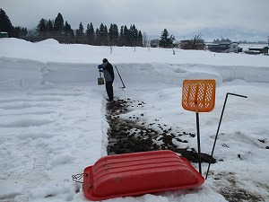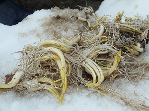 現在、自宅近くの約10aの畑に作付けしており、当日はまだ1メートルを超える積雪が残る中、除雪機等で20cmくらいまで排雪した後、土の中からスコップや鍬を使って丁寧にひろっこを掘り出す作業を拝見しました。