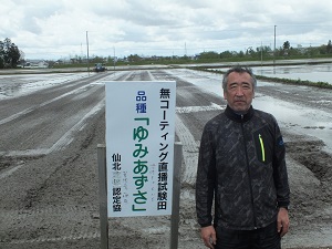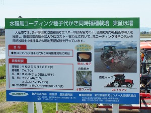 5月12日、大仙市が実施した「直播栽培(無コーティング種子代かき同時播種)の実証ほ場現地検討会」に参加しました。