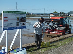 報道陣を前に出島氏は、「田植えを早くし、生育期間を長くする事で少しでも多く収量に結びつけるよう工夫した」などと話していました。