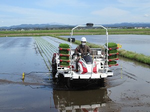 北川目ファームでは、無コーティング直播、鉄コーティング直播、移植栽培の3通りの田植えで作業分散を行いながら省力化を図っています。