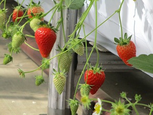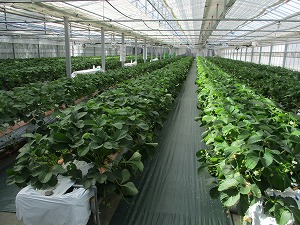 | 意見交換の様子(左から藤田地方参事官、佐藤代表取締役) | 施設内の様子 | いちごの様子 |