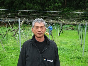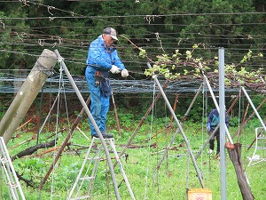 | ぶどう棚の被害状況を説明する小川部会長(中央) | 折れた幹や倒れたぶどう棚の修復作業を行う小川部会長の父 豊治さん | ぶどう部会の小川部会長 |