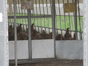 | 意見交換の様子(左側奥から、センター長、管理課長、指導係長) | 比内地鶏の養鶏ハウス | 養鶏ハウス内の比内地鶏 |