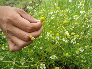 | 意見交換の様子(右奥から農林課課長補佐、生薬生産者) | 乾燥して生薬になるカミツレの花 | キキョウの栽培について説明を受ているところ |