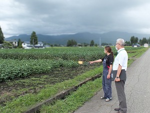 | 意見交換の様子 | ほ場で熱心に説明する菊池氏 | 順調に生育しているエダマメのほ場 |