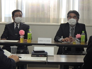 意見交換では、はじめに、山本地方参事官からお祝いの言葉を述べ、企業組合さくらの郷代表理事組合長の齋藤寛一さんと道の駅駅長の安齋正人さんからは、これまでの取組やご苦労、受賞の喜び等についてお話をいただいたきました。その後、東北農政局豊かなむらづくり審査会委員の福島大学岩崎由美子教授ほか関係者を交え、今後の課題や目標等について、活発な意見が交わされました。