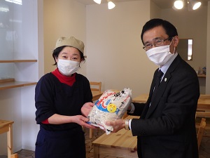 代表の米倉さんからは、「月1回、こどもたちへ食事を提供していて、今回、寄付していただいたお米は、こどもたちのために大切に使わせていただく。」とのお話がありました。また、新型コロナウイルス感染症の影響から、店舗で食事を提供することができず弁当として配布しているので、新型コロナウイルス感染症の早期の終息を強く望んでおられました。