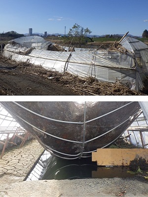 被災したビニールハウス(上)と被災したねぎ洗浄槽(下) | 復旧したビニールハウス(上)と復旧したねぎ洗浄槽(下) |