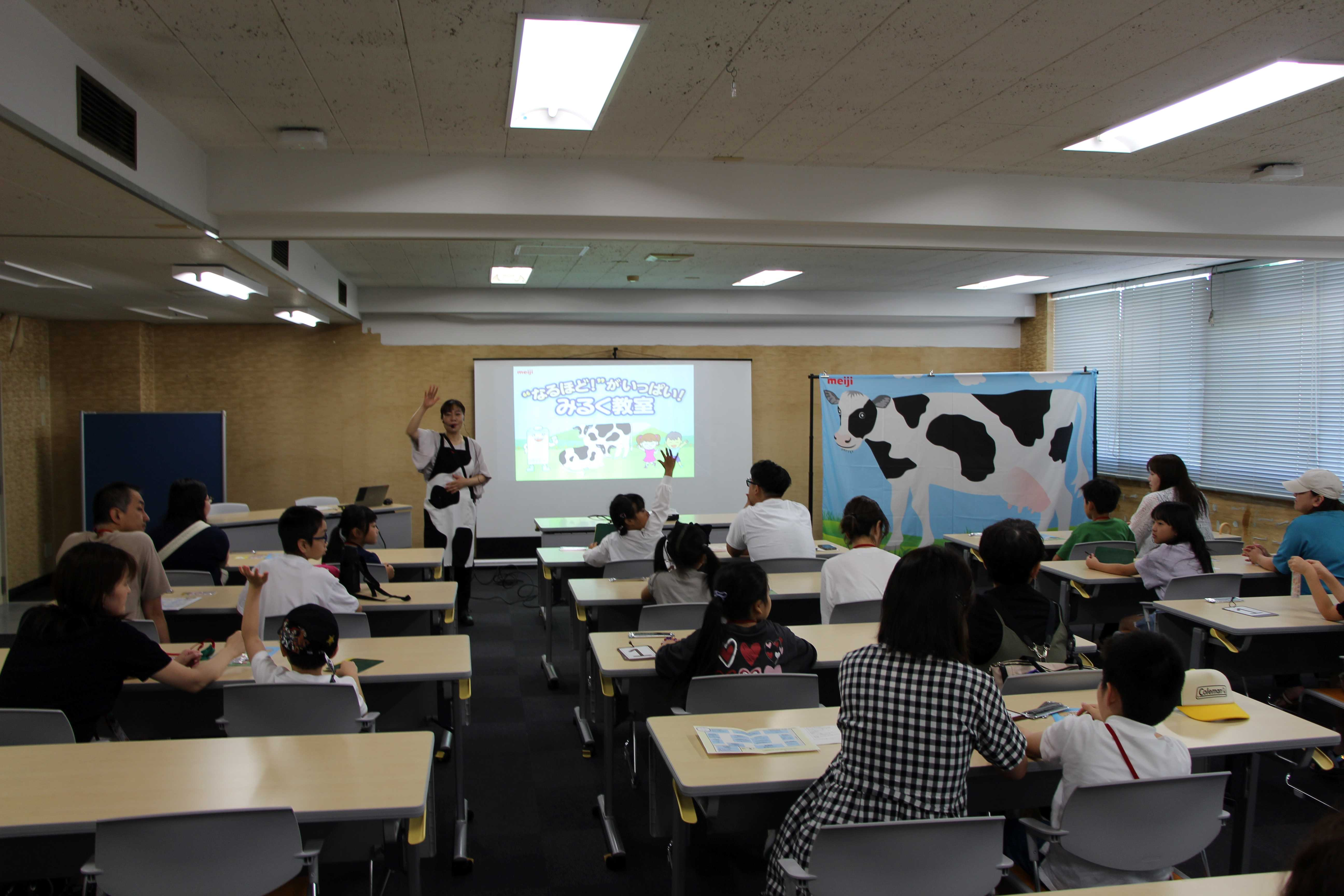 特別企画 みるく教室「元気が出る朝ごはん」(のむヨーグルトづくり体験付き)では、講師である(株)明治の方からクイズを交え、朝ごはんと食べ物についての学びをもとに、自分の食事や生活をどのようにしたらよいかを考えた後、振ってつくるのむヨーグルトづくりを体験しました。